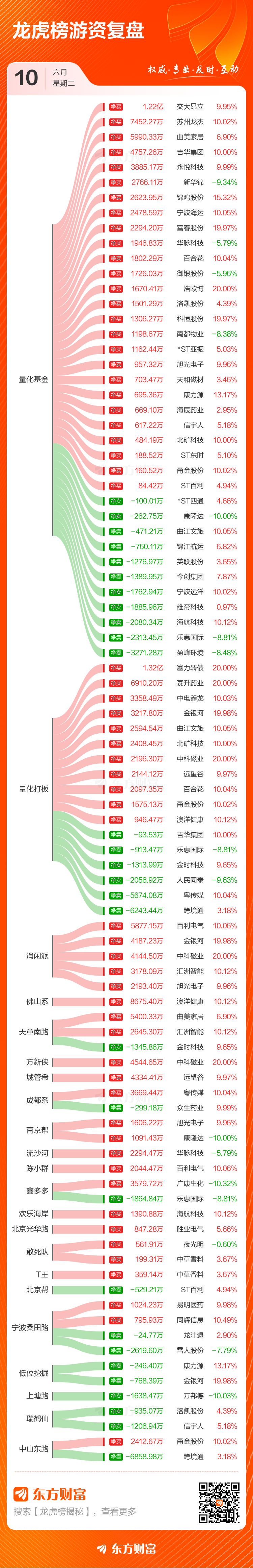 6月10日共有72只个股(含1只可转债)上榜龙虎榜,总上榜成交额130.56亿元。上榜个股中净买入额最高的是曙光数创鹰眼策略,金额为1.44亿元。